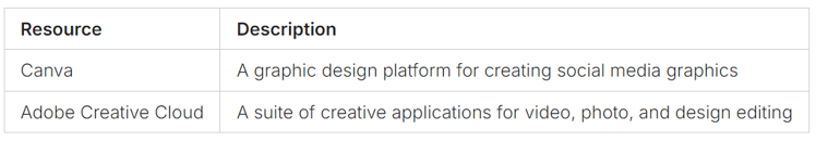 For social media success, you need tools like scheduling platforms and analytics tools. Also, have resources for making content, like design software and stock photos.